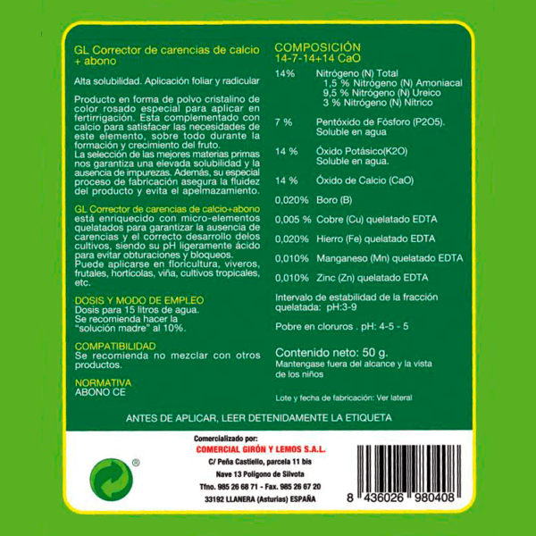 - Aplicar uniformemente sobre el suelo, siguiendo las recomendaciones específicas de dosificación según el tipo de cultivo y la fase de crecimiento.