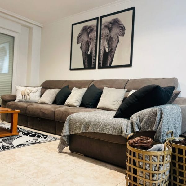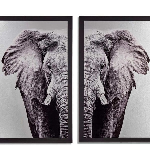 ¡Un elefante en mi salón! Siempre que se trate de un cuadro, el susto se quedará en una anécdota. Fotografía doble en blanco y negro de gran calidad y marco liso que le otorga un toque de elegancia.