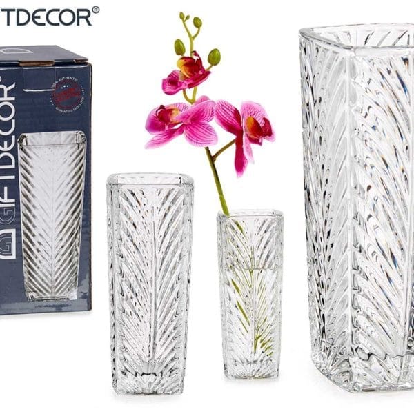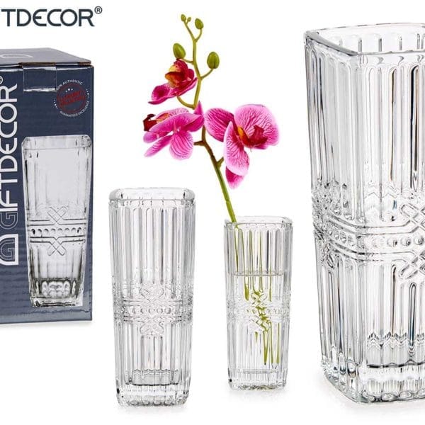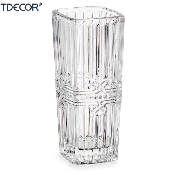 Florero de vidrio cuadrado transparente rayado de 15 cm. 1 unidad. Dimensiones del Producto: 6,4 x 6,4 x 15 cm.