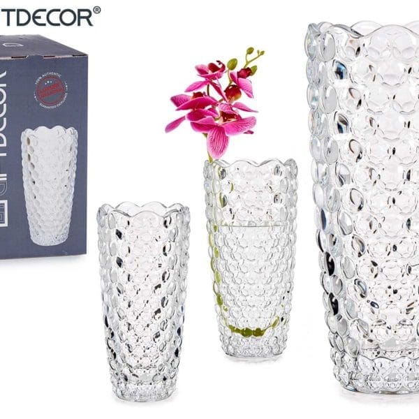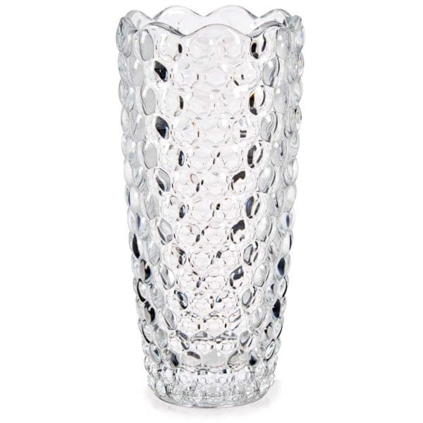 Florero de cristal con detalles en relieve de puntos. Medidas de 29,5 x 14 cm.