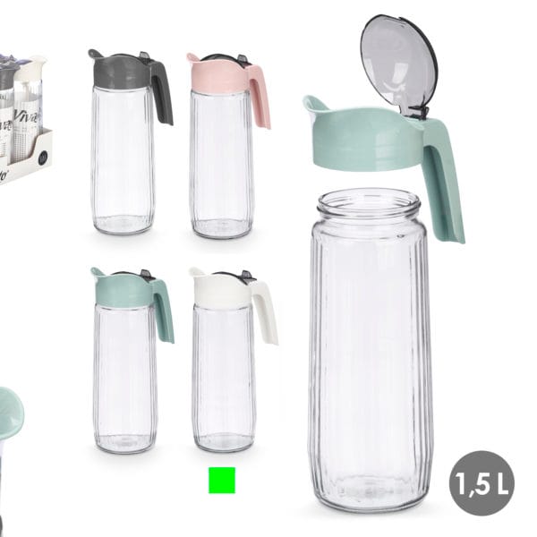Jarra de agua 1,5 litros, tapón verde. 1 unidad. Dimensiones del Producto: 9 x 16,5 x 28 cm.
