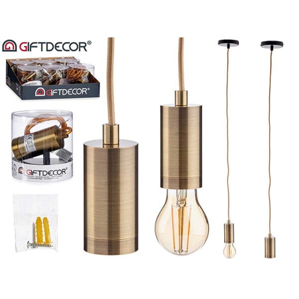Lampara colgante acero oro. 1 unidad. Cable: 1 m max 60W 220v-250v. Tornillos y tacos incluidos. Dimensiones del Producto: 11,5 x 11,5 x 12 cm.