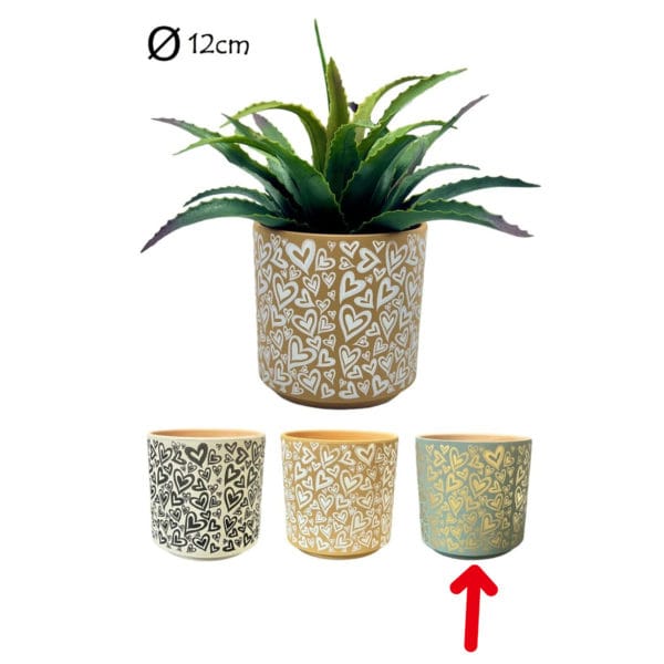 Maceta de terracota con diseño de corazones en color verde. Medidas 13.5 x 13.5 cm.