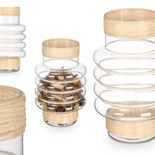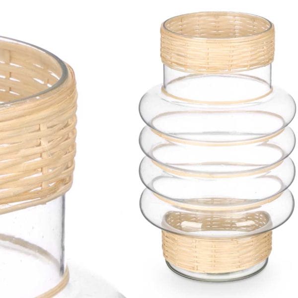 Portavela aros de vidrio y rattan. 1 unidad. Decoración interior no incluida. Dimensiones del Producto: 18 x 18 x 30 cm.