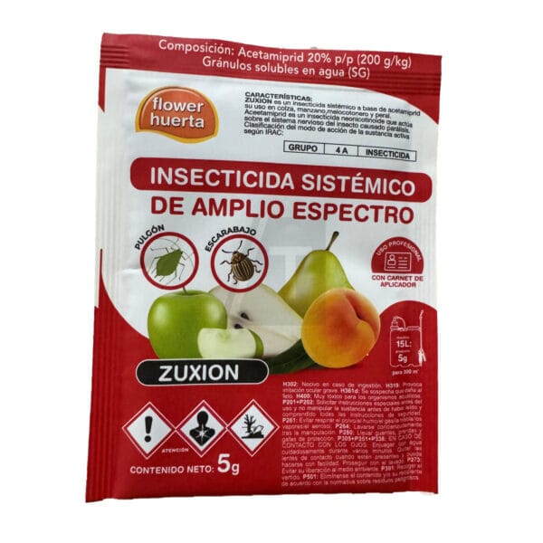 Zuxion, Insecticida sistémico de amplio espectro. 5 gramos. Características. Zuxion es un insecticida sistémico a base de acetamiprid, su uso en colza, manzano, melocotonero y peral. Aceetamiprid es un insecticida neonicotinoide que actúa sobre el sistema nervioso del insecto causando parálisis. Clasificación del modo de acción de la sustancia activa según IRAC: Grupo 4A Insecticida.