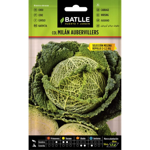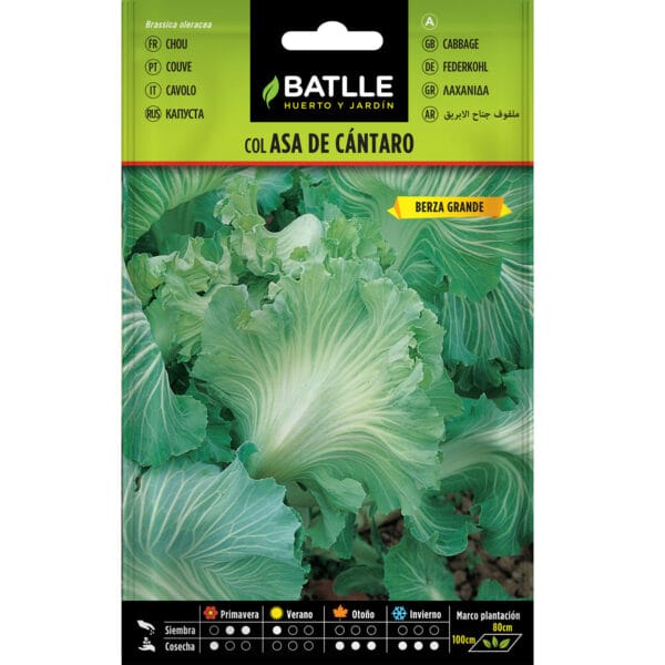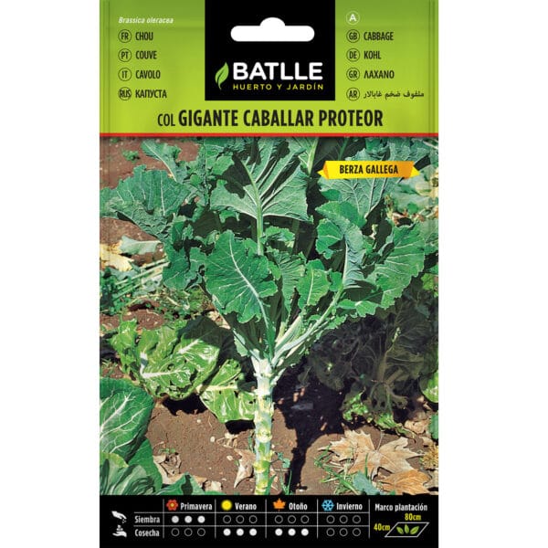 Variedad rústica de pie corto, productiva y con hojas rizadas, col grande de 2 a 2,5 kg.