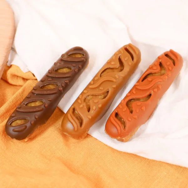 NutraDog presenta la línea de snacks Delicias, ricas baguettes de pollo para perros con cobertura de sabores surtidos.