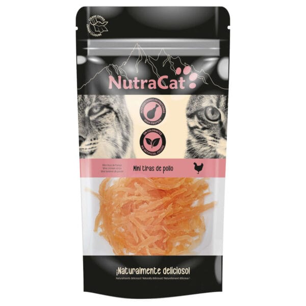 Mini tiras de pollo NutraCat para gatos, snack natural alto en proteínas y bajo en grasa.