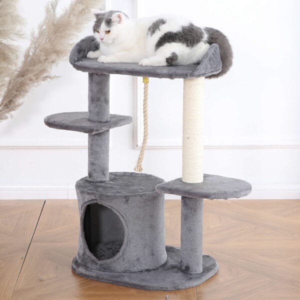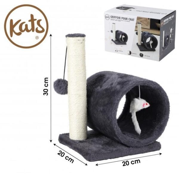 Los dos postes de sisal ofrecen un lugar ideal para rascar y mantener sus garras en forma. El juguete colgante añade una capa adicional de diversión y entretenimiento. El diseño elegante en gris no desentona con la decoración mientras satisface las necesidades de tu gato.