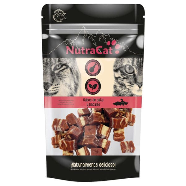 Pequeños cubos de pato y bacalao NutraCat, un snack súper saludable para gatos, con gran aporte de proteínas y sin colorantes artificiales. Paquetes pequeños con cierre zip que conservan la frescura del producto durante más tiempo.