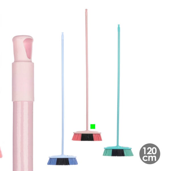 Escoba rosa con palo en color antracita. Medida 120 cm.