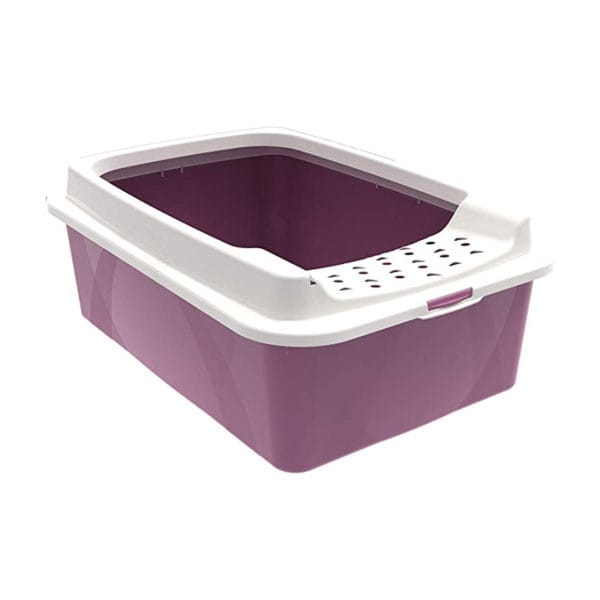 Con superficie curvada en la tapa. Es ideal para gatitos, gatos mayores y enfermos. La tapa extraíble con borde protector garantiza una reducción significativa de arena alrededor del inodoro
