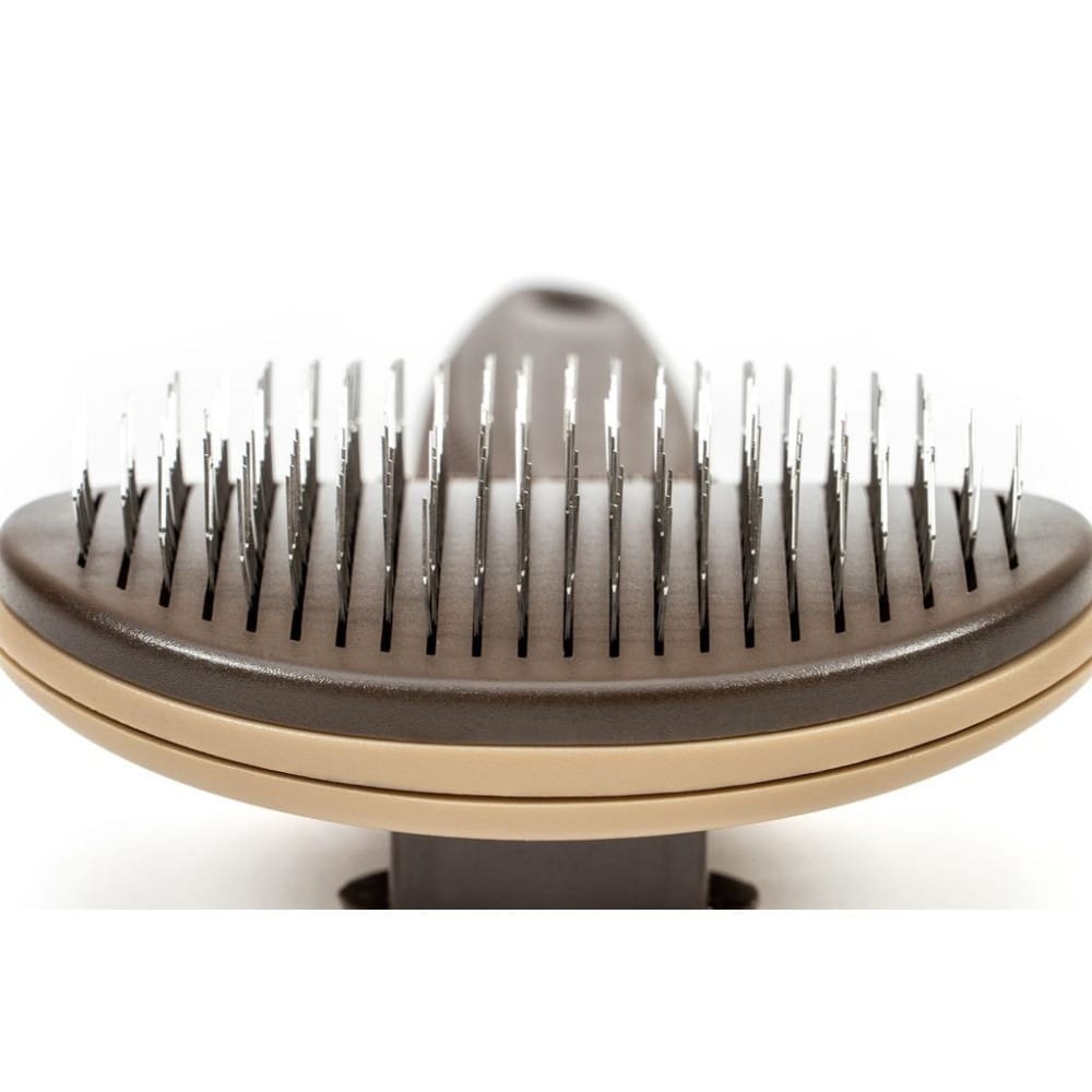 Equipada con un mango de goma ergonómico, ofrece un agarre cómodo y seguro, evitando deslizamientos durante el cepillado y reduciendo la fatiga de la mano. Sus púas metálicas finas y resistentes ayudan a eliminar pelo muerto, suciedad y nudos, favoreciendo un manto más sano, brillante y libre de enredos.