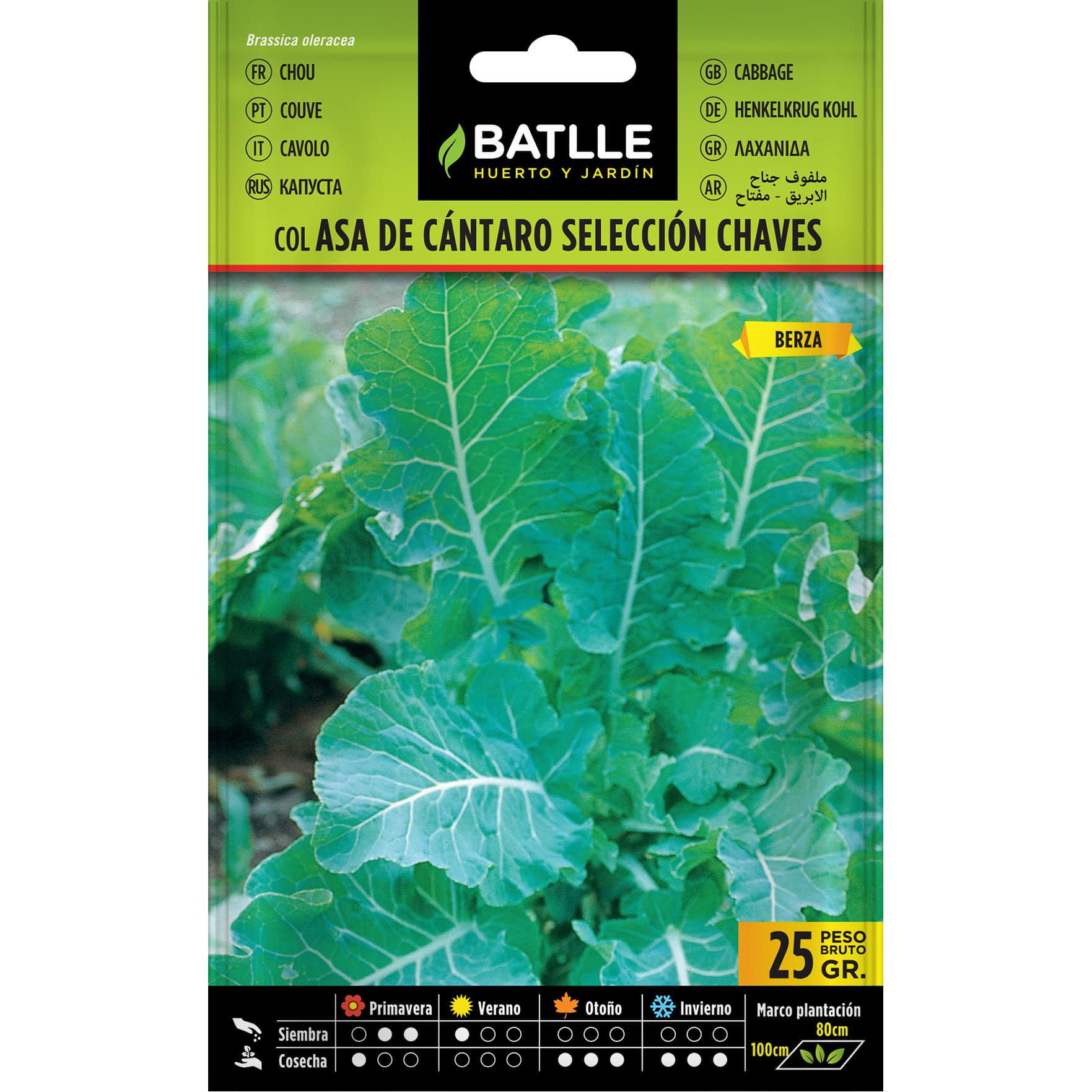 La Col Asa de Cántaro Sel. Chaves es una variedad de col que destaca por sus hojas de gran tamaño. Las hojas exteriores son ideales para forraje, mientras que las hojas interiores y el cogollito son aptos para el consumo humano, lo que la convierte en una opción versátil tanto para alimentación animal como humana.
