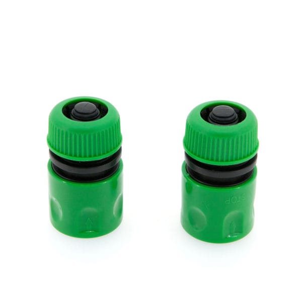 Set de 2 conectores rápidos 3/4″, resistentes y fáciles de instalar, ideales para unir mangueras y accesorios de riego sin fugas.