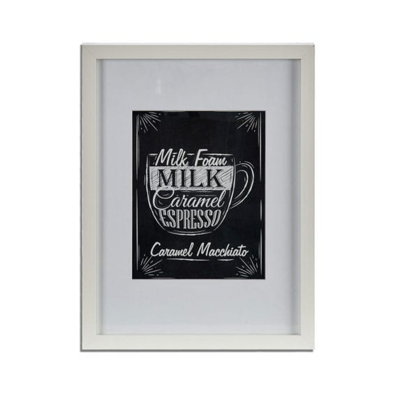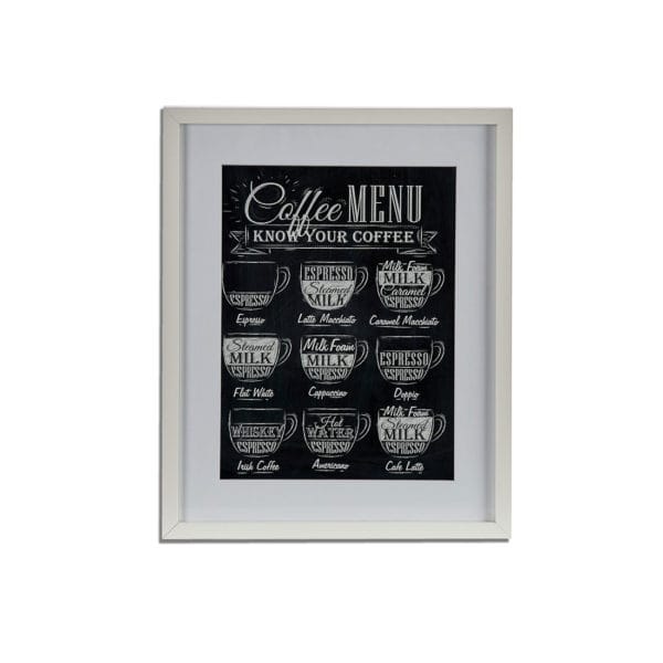El cuadro Coffee con marco blanco 43x33x3 cm es la opción perfecta para quienes desean un detalle decorativo práctico y elegante que aporte calidez y estilo a cualquier estancia.