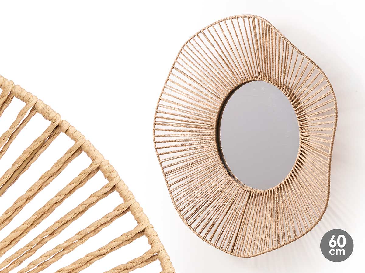 El espejo de 60 cm con diseño de ondas y cuerda es una pieza decorativa que combina estilo natural, funcionalidad y elegancia. Su marco con acabado en cuerda trenzada y diseño ondulado aporta textura, calidez y un toque artesanal, convirtiéndolo en un elemento central para cualquier salón, dormitorio, recibidor o baño.