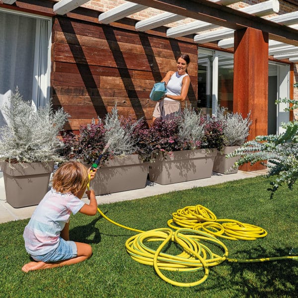 Las diferentes combinaciones de la jardinera Cleo con seis ruedas que os permiten organizar, a vuestro gusto, el jardín con macetas donde poner vuestras plantas preferidas. Color Vinaccia.