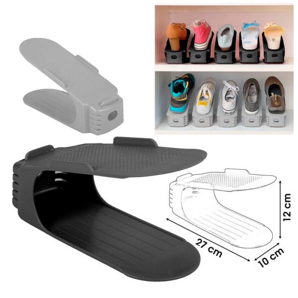 Su sistema ajustable y compacto facilita colocar cada par de zapatos de forma estable y accesible, evitando desorden y protegiendo el calzado de deformaciones. El color gris neutro lo hace elegante y discreto, combinando fácilmente con cualquier estilo de mobiliario.