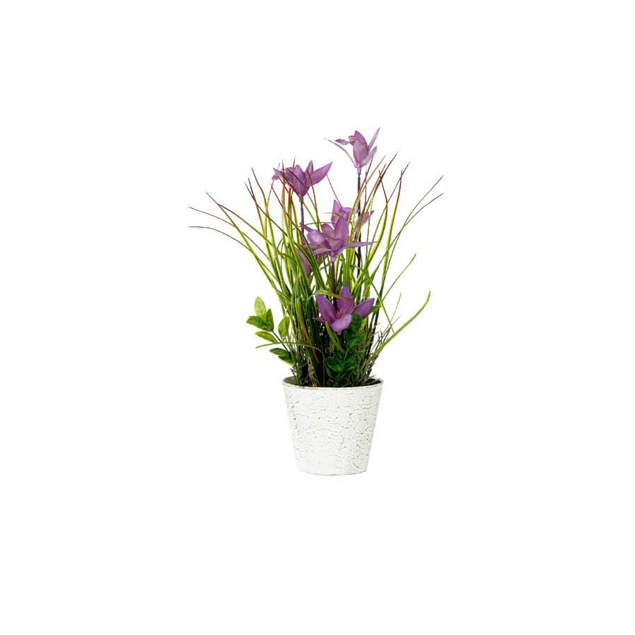 Su estilo atemporal la convierte en una opción versátil para hogares, oficinas, restaurantes o eventos que busquen una decoración floral lista para lucir. La combinación del acabado envejecido y el tono suave de la flor lila añade calidez y personalidad a cualquier ambiente.