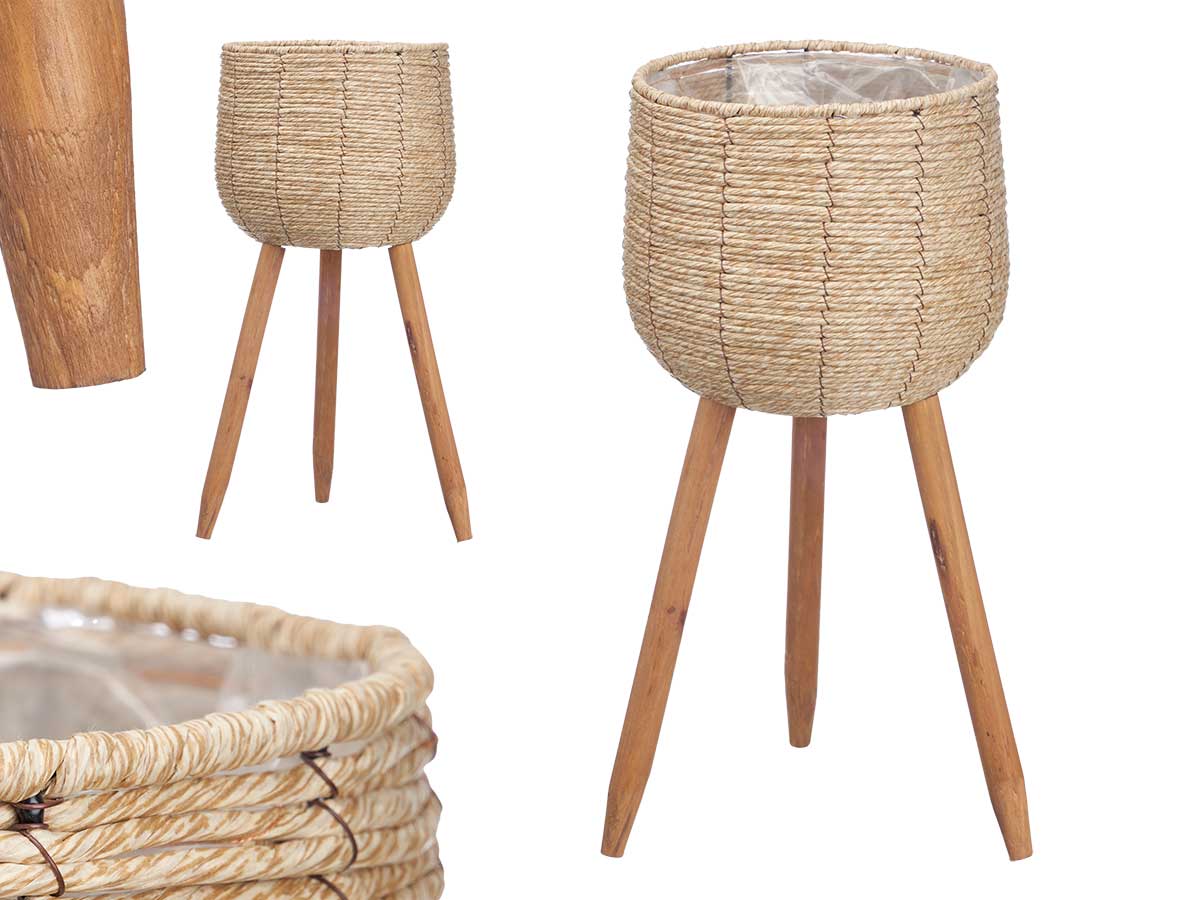 Fabricado con materiales resistentes y acabados en tonos claros, este macetero combina funcionalidad y estilo. Su estructura con patas estables de madera o metal (según modelo) le da una apariencia natural y ligera, ideal para decoraciones nórdicas, boho o contemporáneas.