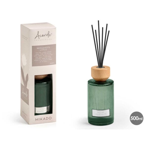 Este mikado combina un frasco decorativo de vidrio acanalado y tapa de madera natural, junto con varillas absorbentes que difunden la fragancia de forma progresiva y homogénea. Con su fórmula sin alcohol y sin llama, garantiza un ambiente agradable sin complicaciones.