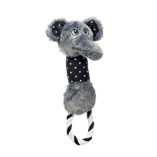 Fabricado con 100% poliéster y plástico resistente, este mordedor está pensado para soportar el uso diario, ayudando al mismo tiempo a fortalecer la mandíbula y a promover una correcta higiene dental. Su forma alargada, dimensiones de 9,5 x 11 x 34 cm, y colores llamativos en blanco y negro lo hacen atractivo tanto para perros pequeños como medianos.