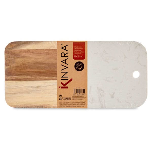 Su diseño moderno y elegante, con contraste entre los tonos cálidos de la madera y la pureza del mármol, convierte esta tabla en un accesorio decorativo ideal para cualquier cocina o mesa. Gracias a sus dimensiones de 30 x 15 x 1,3 cm, es compacta, funcional y fácil de almacenar, manteniendo siempre una apariencia sofisticada.