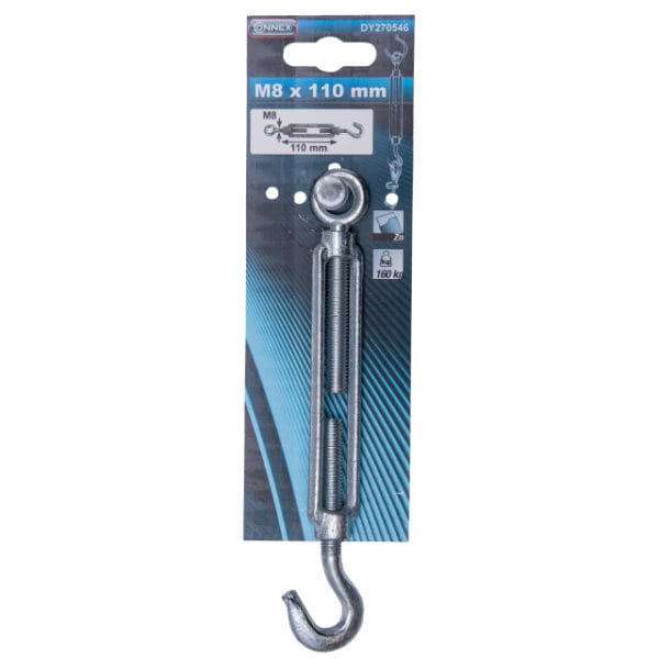 Su diseño con un extremo en gancho y otro en argolla permite un ajuste preciso y seguro de la tensión, soportando cargas de hasta 50 kg. Es perfecto para instalaciones de cercas, lonas, toldos, estructuras ligeras y sistemas de sujeción.